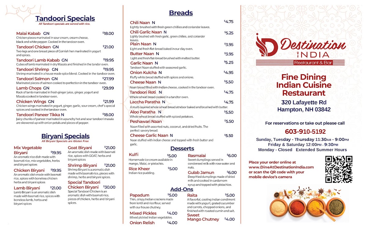 Destination India Restaurant & Bar Hampton NH Menu (Update 2025)